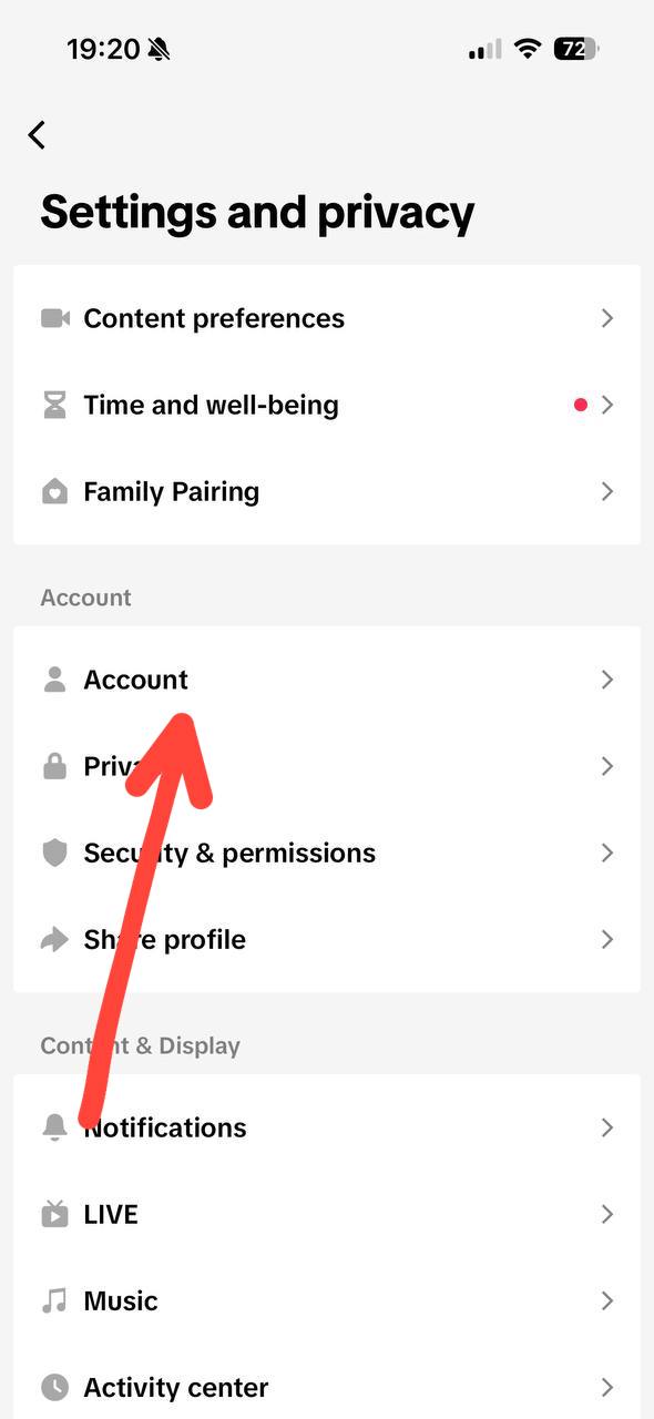 In Settings and Privacy, find and tap Account