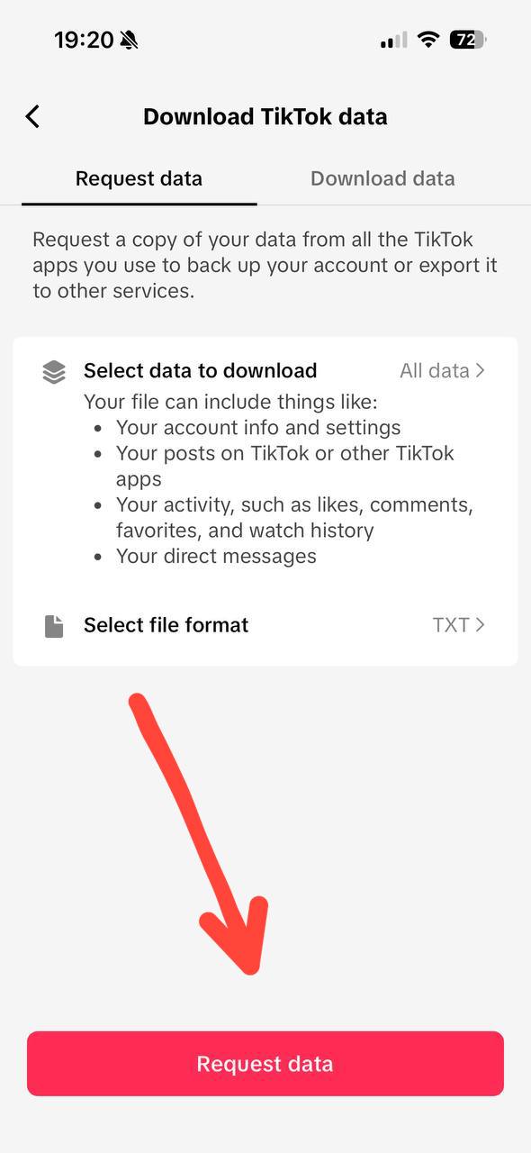 Change format to "JSON", select "All data", then tap "Request data"